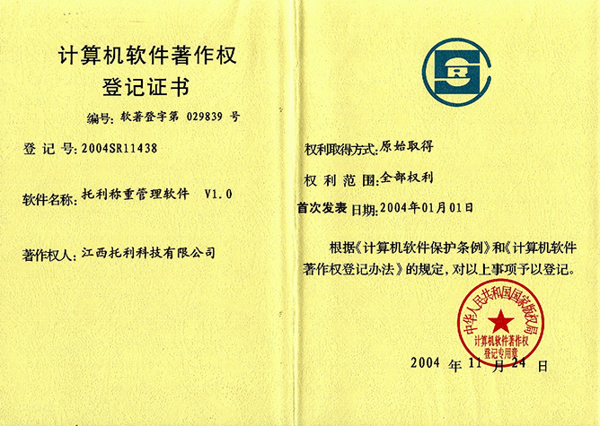 大力引進軟件人才,致力于稱重領域的軟件開發(fā),【托利稱重管理軟件V1.0】榮獲公司首個軟件著作權