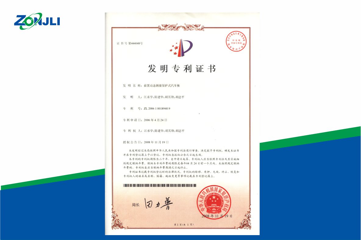 汽車衡技術研發(fā)取得重要突破,【動態(tài)測量保護式汽車衡】榮獲發(fā)明專利(專利號:ZL200610018940.9)